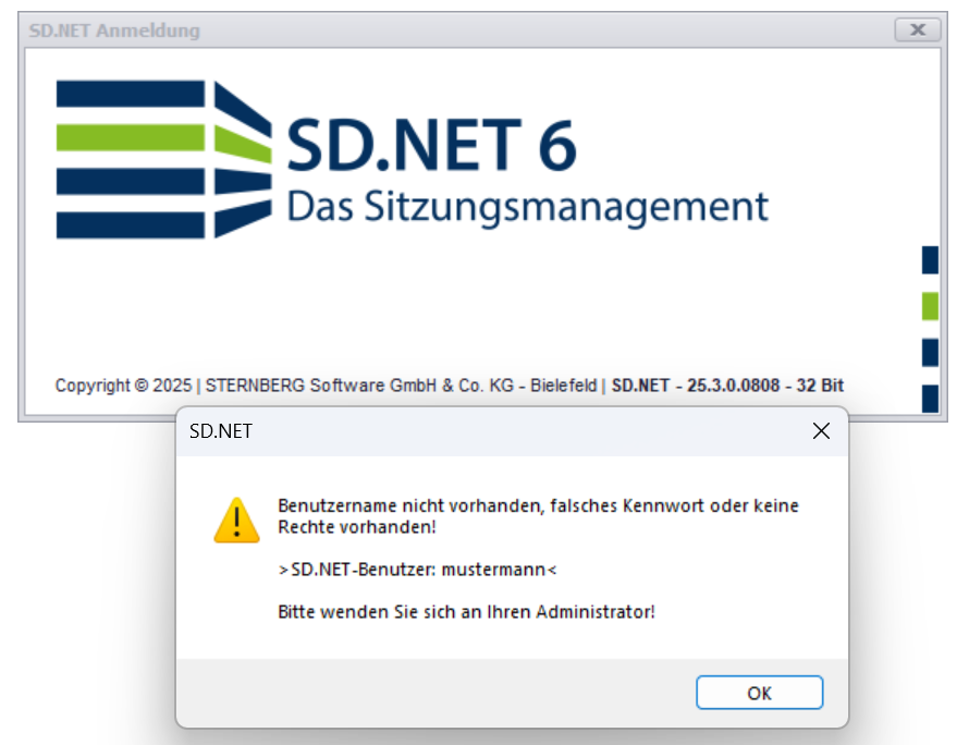Sofern es bei der Anmeldung zu diesem Hinweis kommt, dann ist entweder der Login oder das Kennwort fehlerhaft. Versuchen Sie eine erneute Eingabe oder wenden Sie sich an Ihren Administrator.